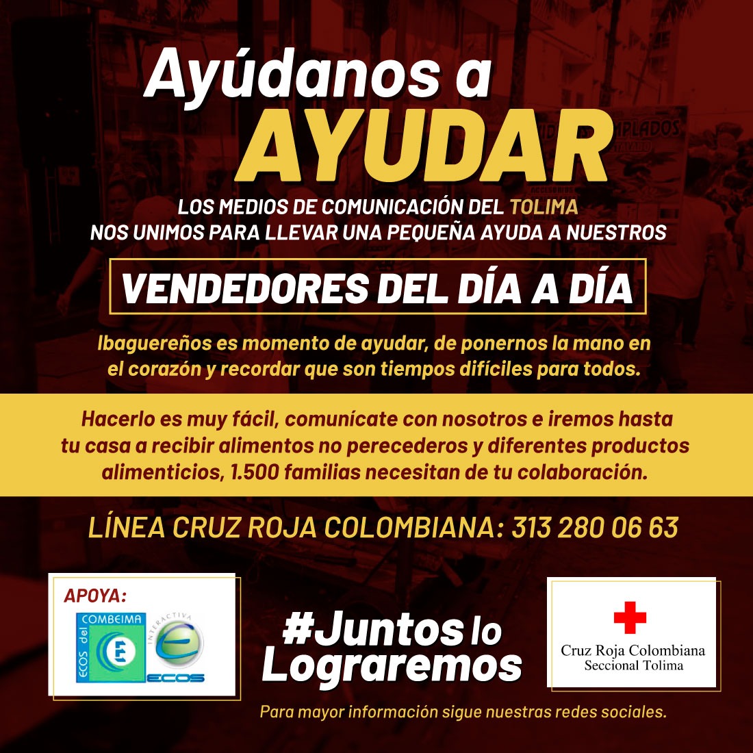 Ibaguereños, llegó la hora de ayudar. Mil 500 vendedores ambulantes no tienen los recursos económicos para comer en estos 20 días que estaremos en casa. Esta fue una de las premisas que analizaron los líderes de más de 40 medios de comunicación del Tolima que se unen en esta noble causa donde la Cruz Roja será el aliado más importante.